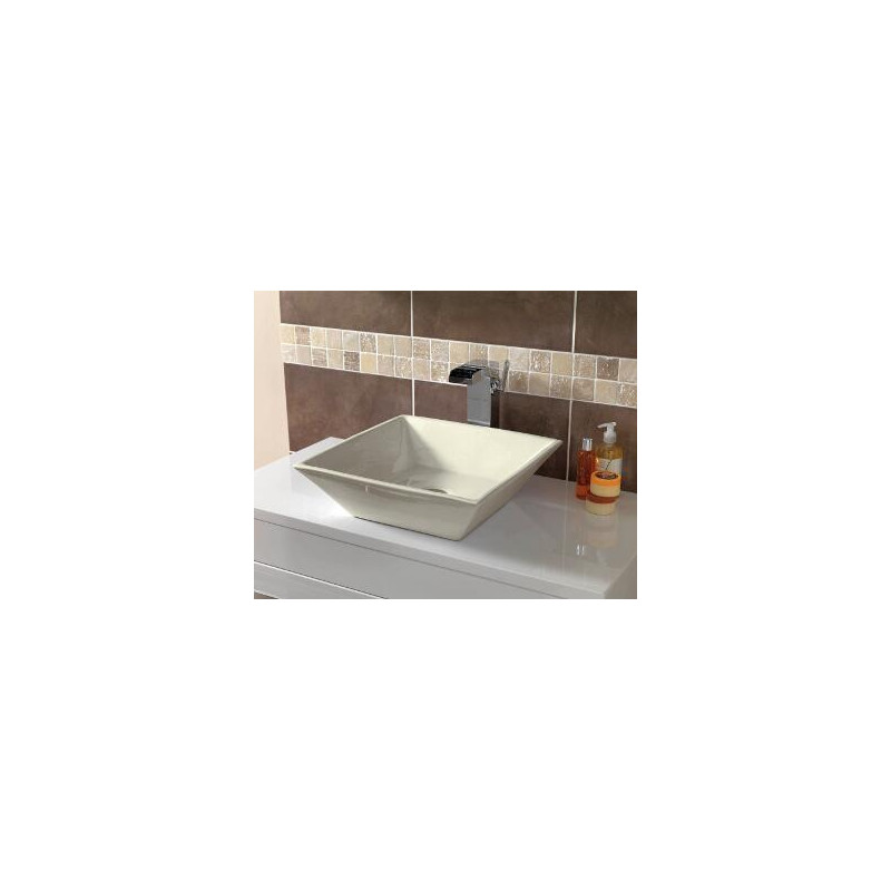 It features a square shape. This vessel set is designed to be installed as a above counter vessel set. It is constructed with ceramic. This vessel set comes with a enamel glaze finish in Biscuit color. It is designed for a deck mount faucet.