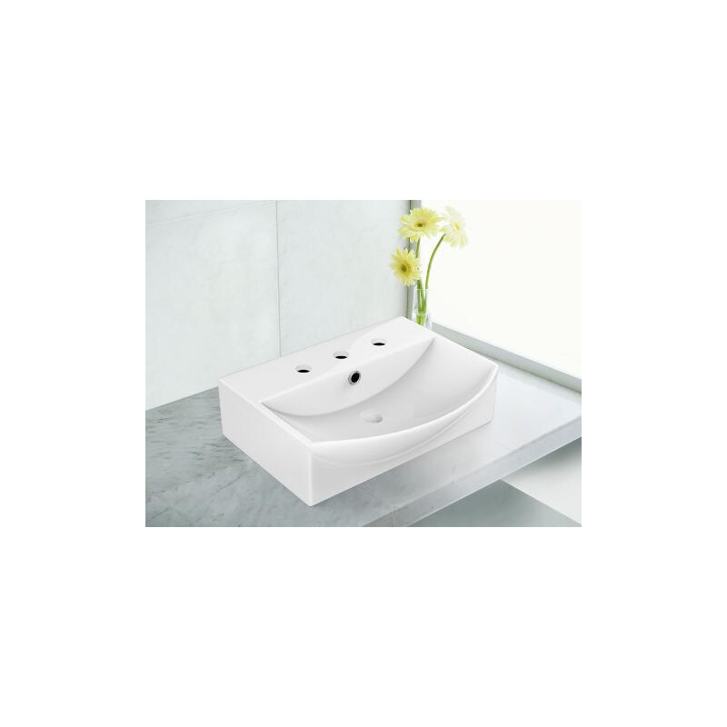 It features a rectangle shape. This vessel set is designed to be installed as a above counter vessel set. It is constructed with ceramic. This vessel set comes with a enamel glaze finish in White color. It is designed for a 3h8-in. faucet.